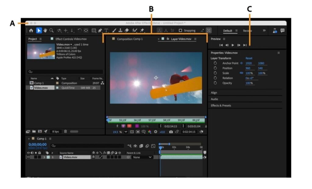 Unlike Premiere Pro, After Effects uses Layers instead of traditional tracks.